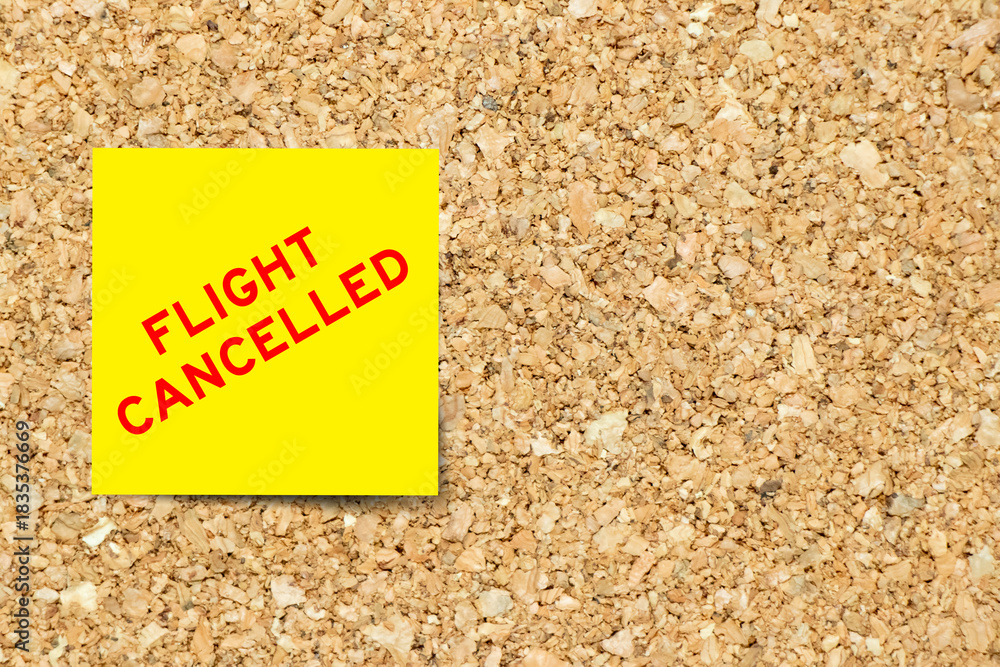 Yellow note paper with word flight cancelled on cork board background with copy space