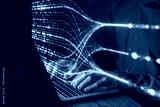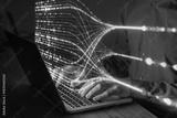 Programmer typing on laptop with colorful data flow visualization, concept of artificial intelligence, big data analysis, machine learning, and digital technology innovation