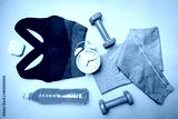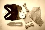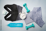 Workout flat-lay with sport wear, dumbbell, skipping rope, headphones and watch on gray background top view