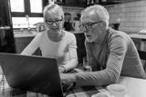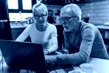Senior couple using a laptop together at the kitchen table, focused on browsing or managing online tasks
