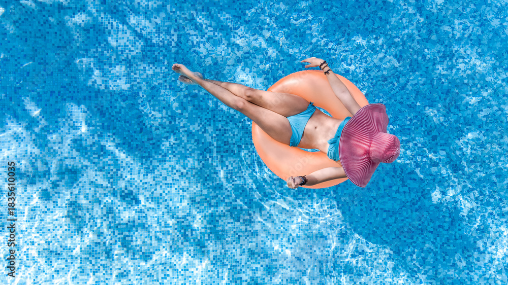 Aerial drone view of beautiful woman in hat relaxing in swimming pool, young girl in bikini swims on inflatable ring donut and has fun in blue pool water, tropical vacation on holiday resort