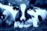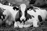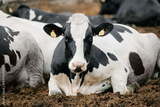 Portrait Holstein cow resting, black and white dairy cattle in farm setting