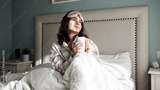 Woman with sleep mask, sitting in cozy bed, holding a warm mug, enjoying morning light streaming through window, creating a serene and peaceful atmosphere for relaxation