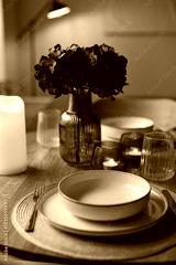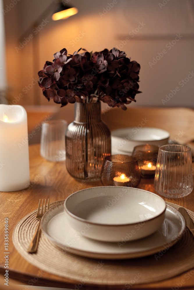 Wooden round table setting with glassware and vase creating a stylish evening atmosphere