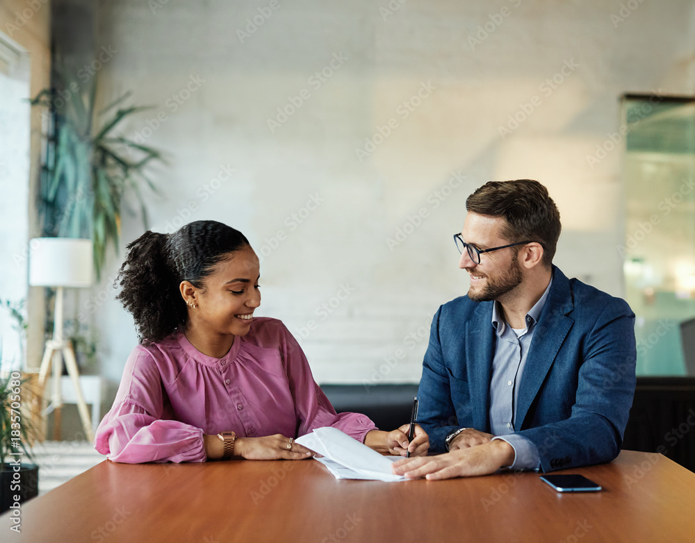 Group of young and senior business people having a meeting and signing a contract agreement in the office. Teamwork and success concept