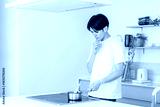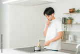 A young Asian man wondering what to do while cooking in his home kitchen