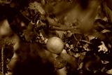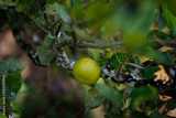Green lime citrus fruit on lichen-covered branch with mottled damaged leaves