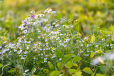Colorful flower scene, Energetic landscape showcasing blooming purple blossoms, Dynamic scene of cheerful purple flowers amidst textured green foliage and nectar hints