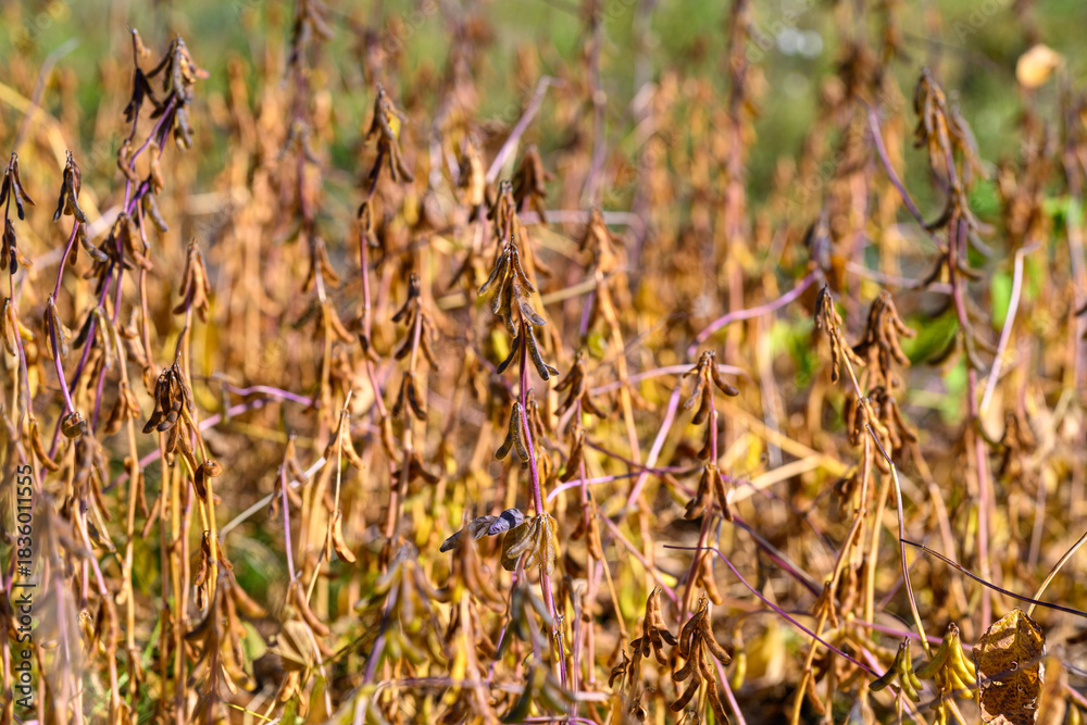 Agricultural fields with mature soybeans and harvesting equipment staged, Rural soybean fields showcasing fully ripened pods and prepared machinery for laborintensive collection