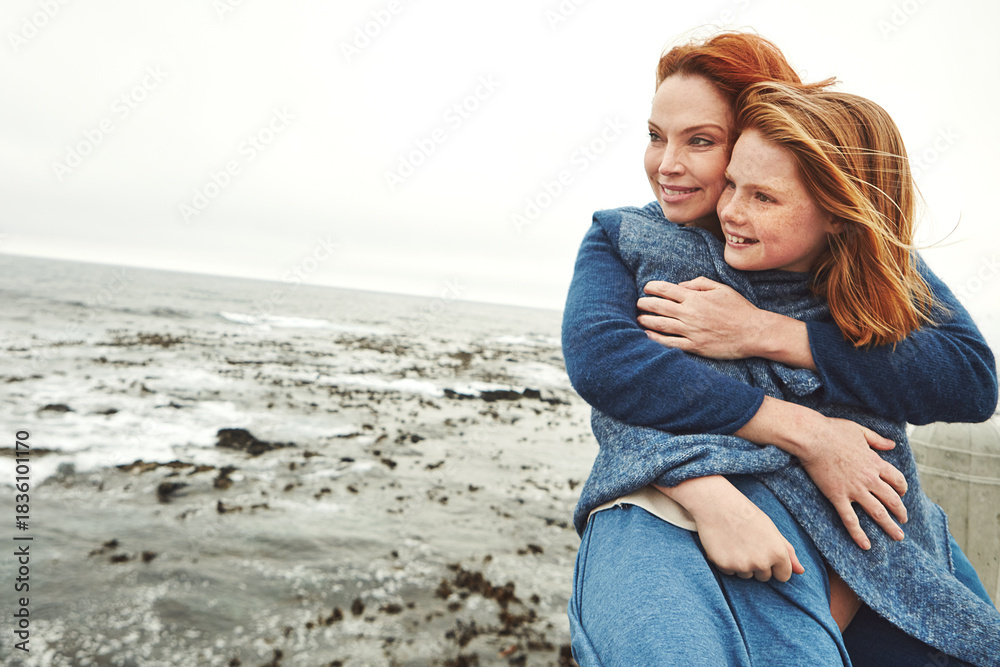 Beach, embrace and mother with girl, love and bonding together with happiness, relax and tourism. Ocean, family and mama with daughter, weekend break and hug with space, blanket and view in Canada