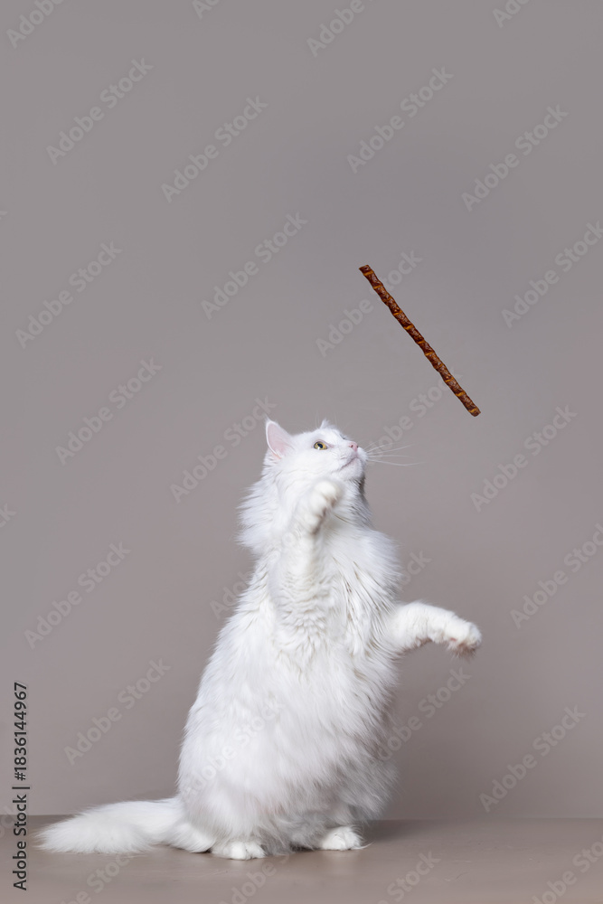 White cat jumps to catch a flying snack meat stick