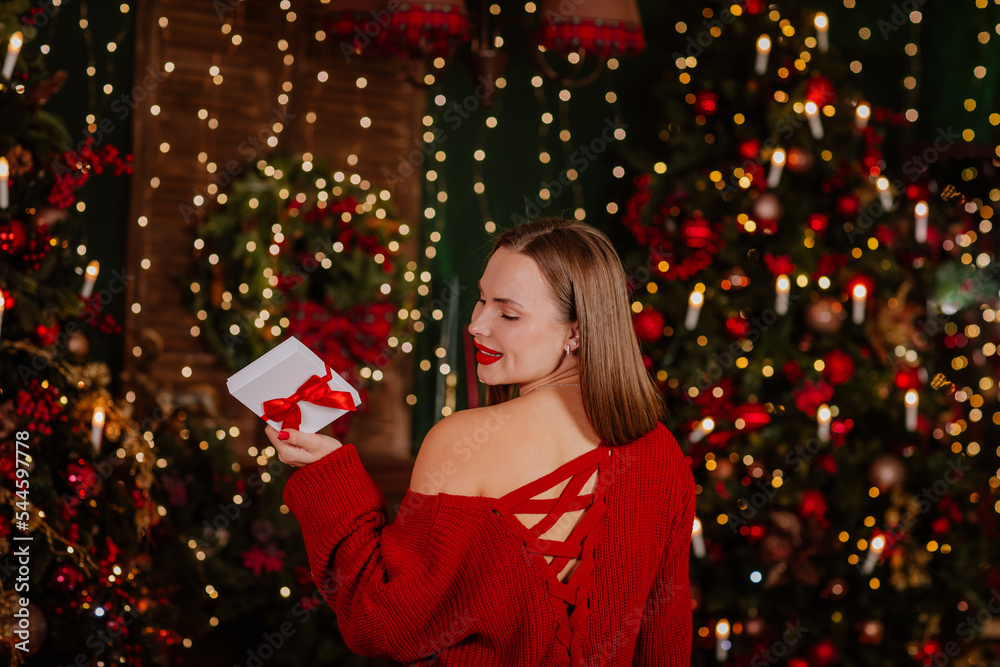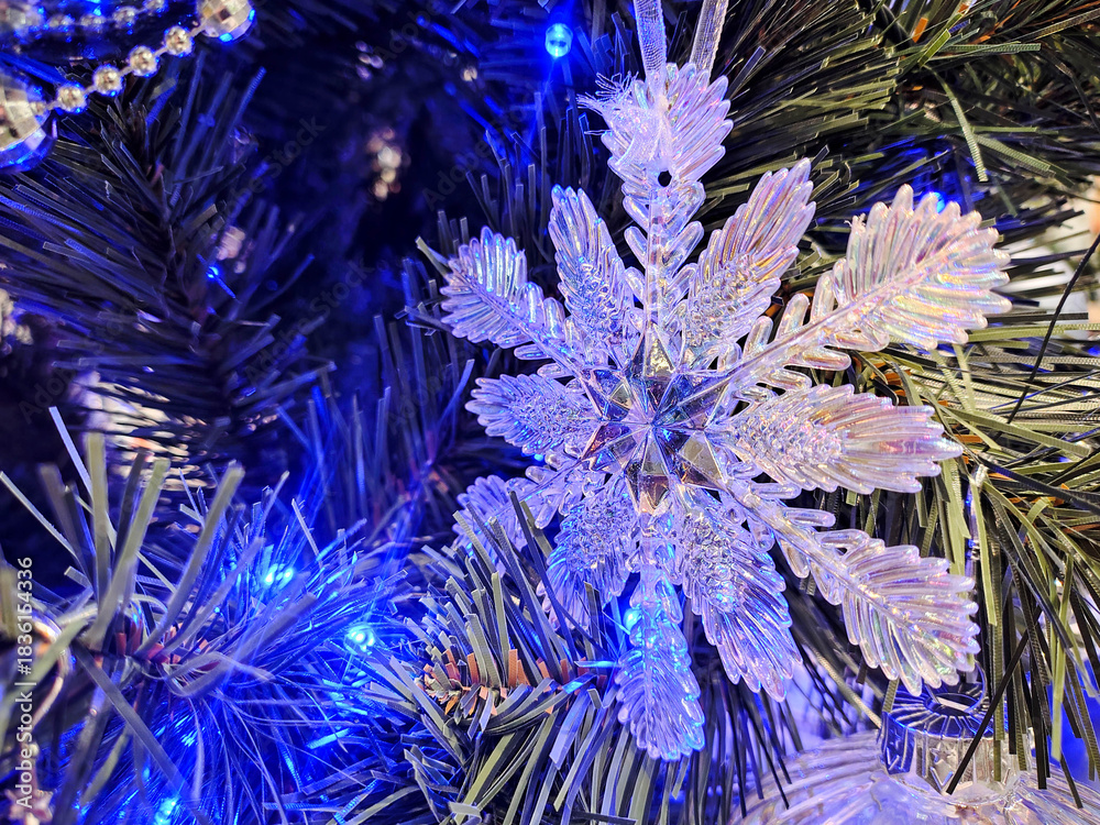 Christmas decorations hanging on the Christmas tree. It's holiday time.