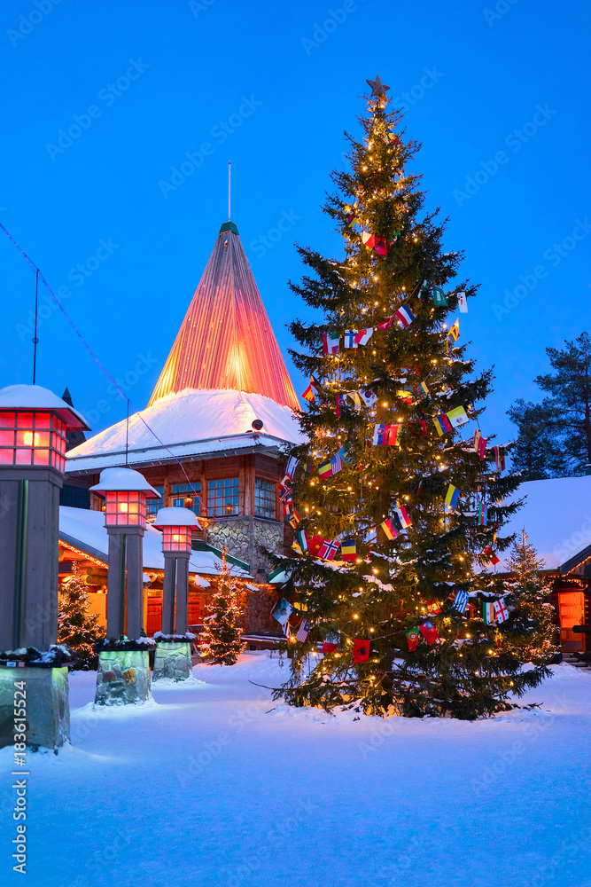 Arctic Circle lamps at Santa Office in Santa Village evening