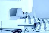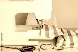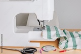 Exploring the Art of Sewing: A White Sewing Machine with a Green and White Fabric, Scissors, and Accessories on a Tabletop