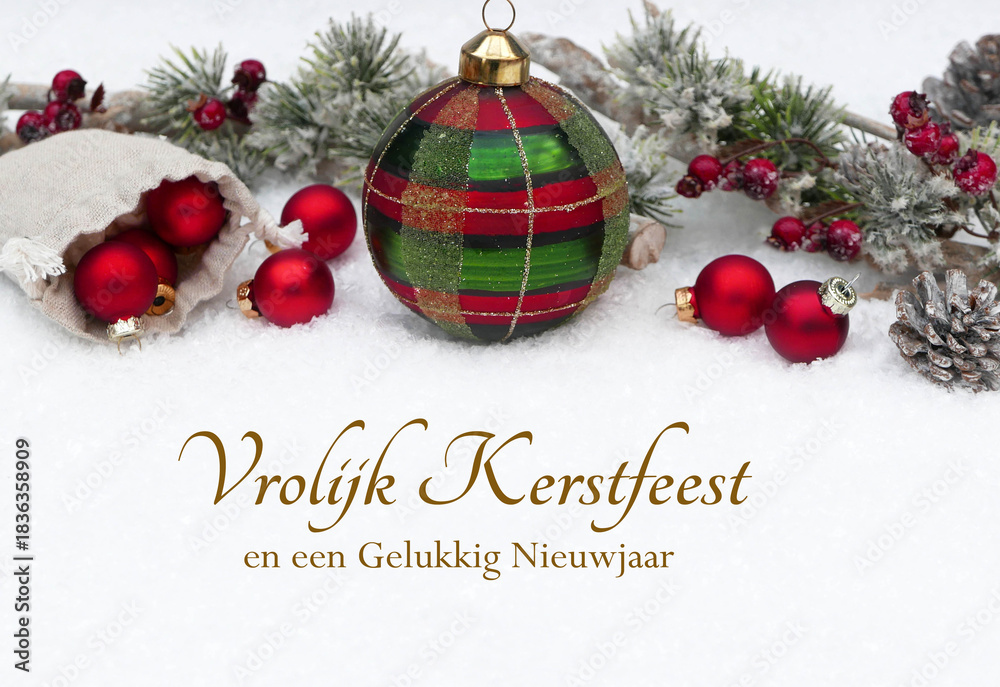 Kerstkaart: Winterlandschap met kerstversiering en dennentakken in de sneeuw. De tekst "Prettige Kerstdagen en een Gelukkig Nieuwjaar" staat in de sneeuw geschreven.
