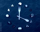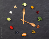 Intermittent fasting concept, spoon and fork with small portions of food looking as a clock on a black slate background