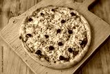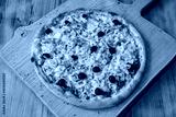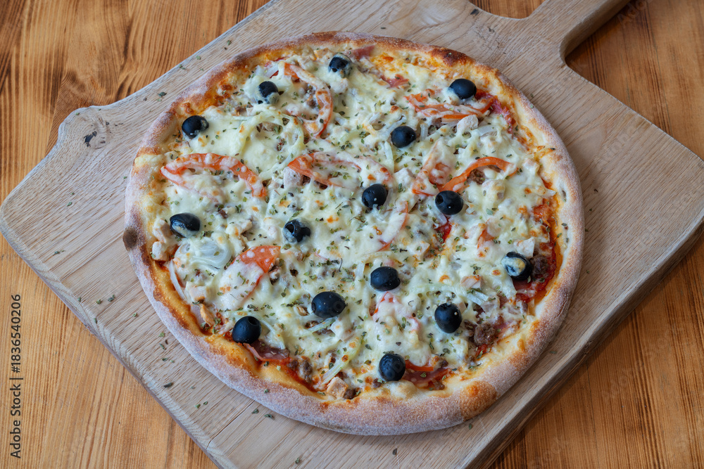Freshly baked pizza topped with olives and cheese, served on a wooden board, showcasing delicious culinary artistry and vibrant colors