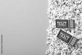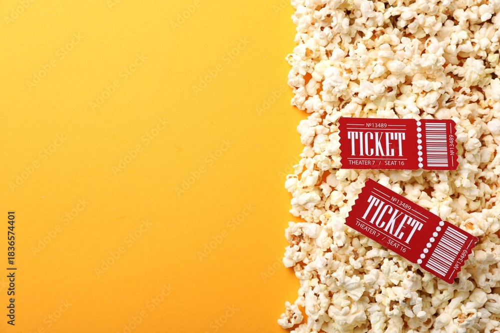 Tasty popcorn in paper cup and movie tickets on orange background, flat lay. Space for text