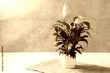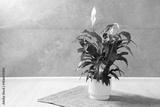 Beautiful spathiphyllum (peace lily) houseplant with flowers on floor indoors. Space for text