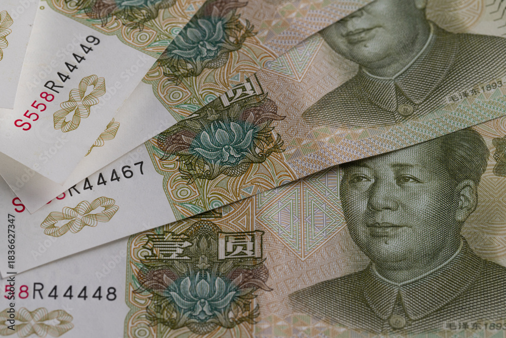 Close Up Full Frame Background of Chinese Yuan Banknotes with Mao Zedong Portrait