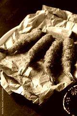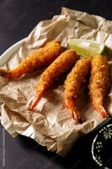 Closeup Crispy fried shrimp with lime on parchment paper