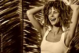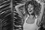 Smiling woman with curly hair enjoys tropical sunlight wearing white tank top under palm leaves, expressing happiness and natural beauty in vibrant outdoor setting.