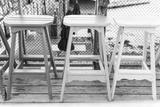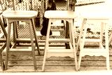 Colorful vivid chairs painted green and yellow on waterfront bar restaurant