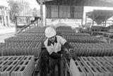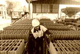 A construction manager inspects rows of fresh concrete cinder blocks at a small building material manufacturing plant, focusing on stock and quality.