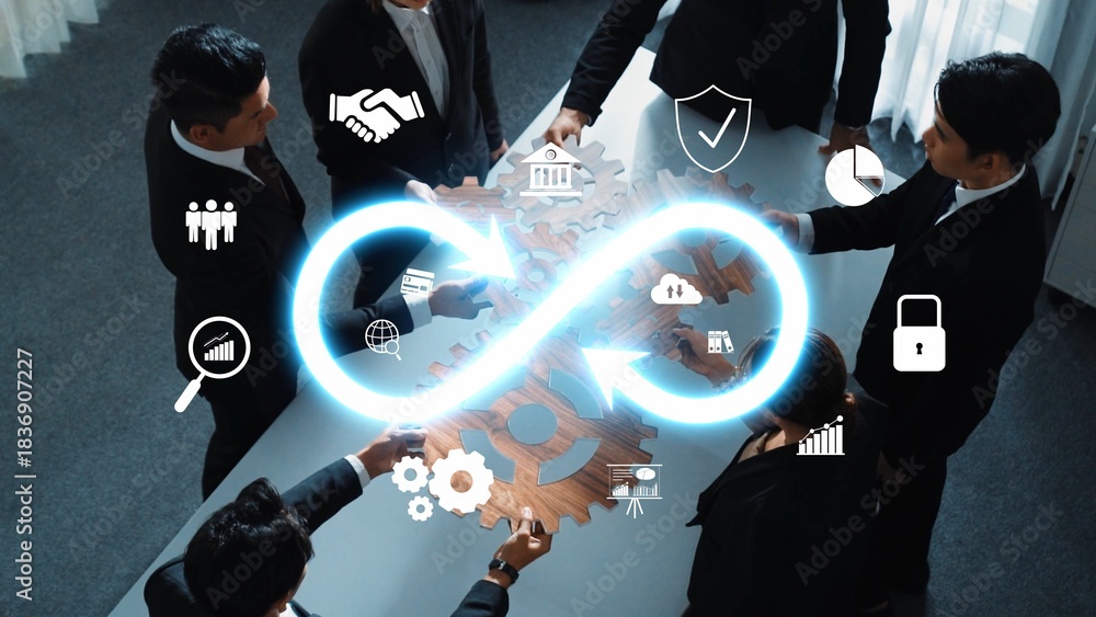A captivating scene of business professionals collaborating in a meeting, featuring graphics of innovation, teamwork, and strategic planning for effective results. Raster