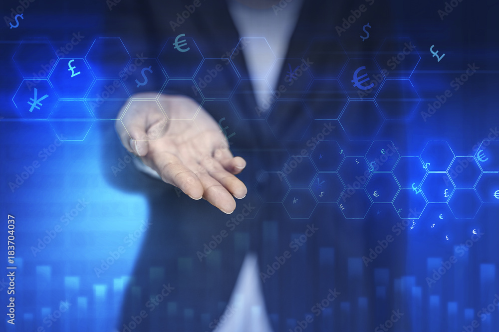 double exposure of business woman open hand with stock trading element