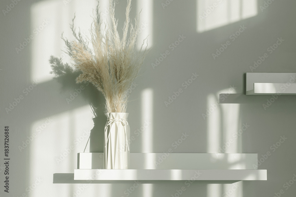 Home interior floral decor. Dried flowers in vase on white shelf. Background with shadow lights. Color of the Year 2026 Cloud Dancer