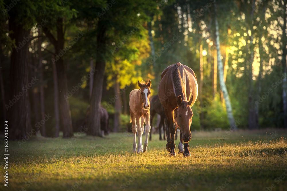 Mare and foal in sunlight