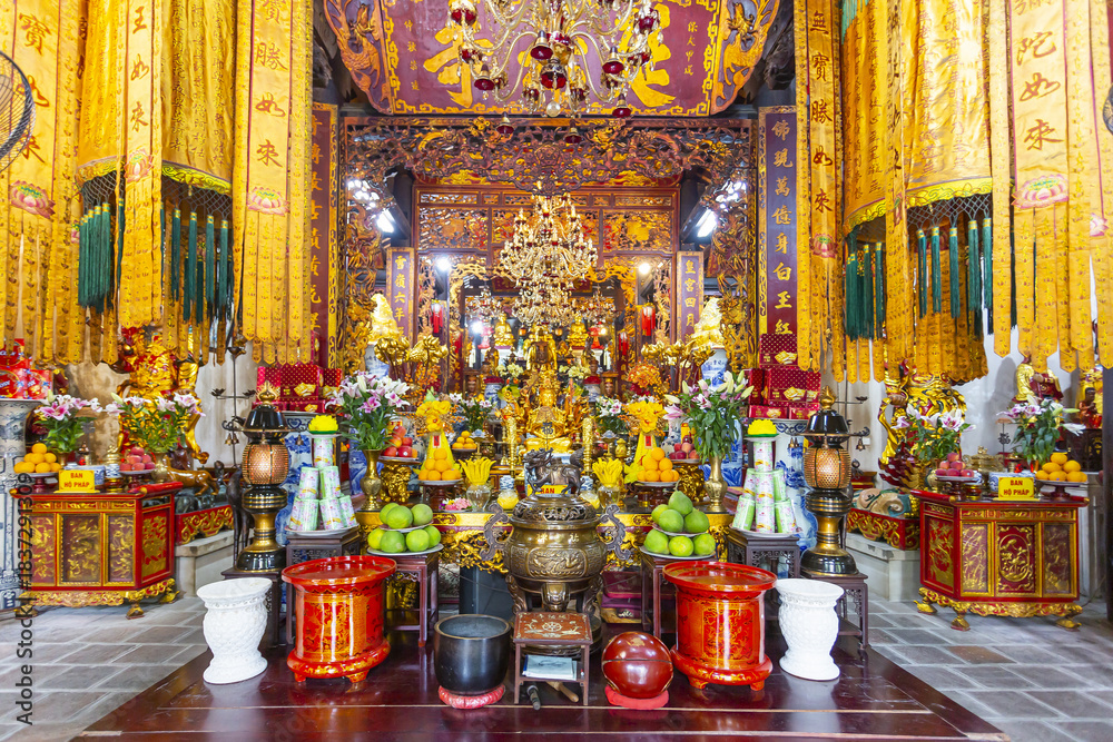 Altar with offerings in the traditional Buddhist shrine Dien Huu in Hanoi