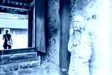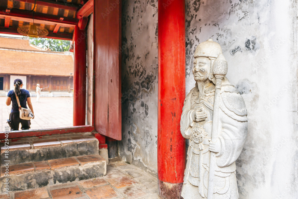 Small traditional pavilion with red pillars and tiled roof in the courtyard of Hanoi's Temple of Literature