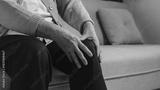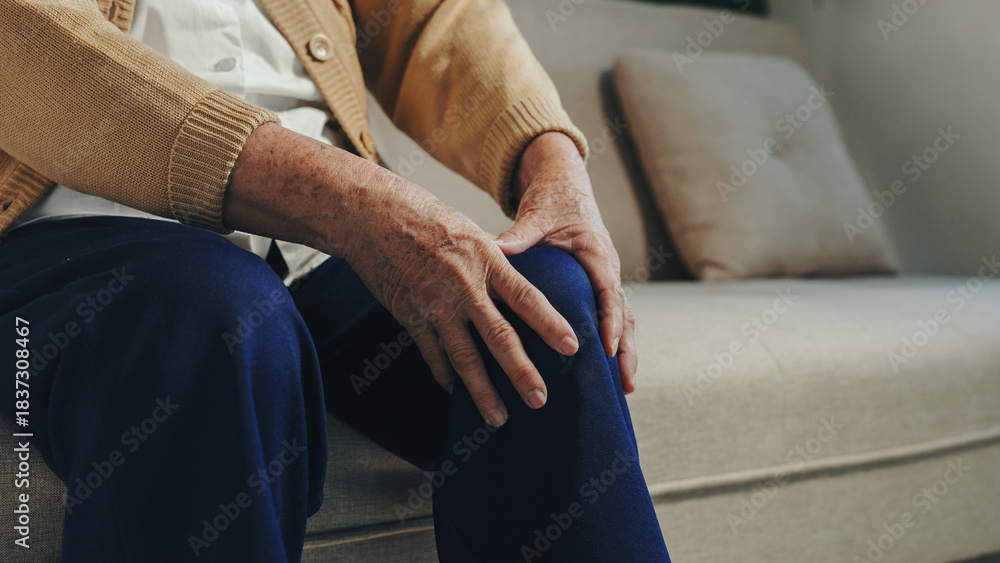 Elder woman suffering from chronic knee pain due to arthritis, holding her leg in discomfort, showing health issues and aging