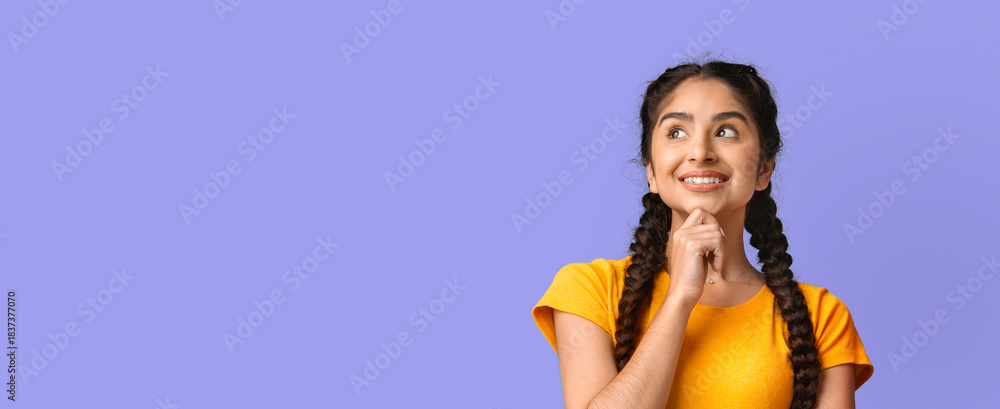 A girl with long braids and a cheerful expression is thoughtfully smiling while standing against a soft purple background. She appears to be pondering or considering something happy.