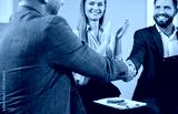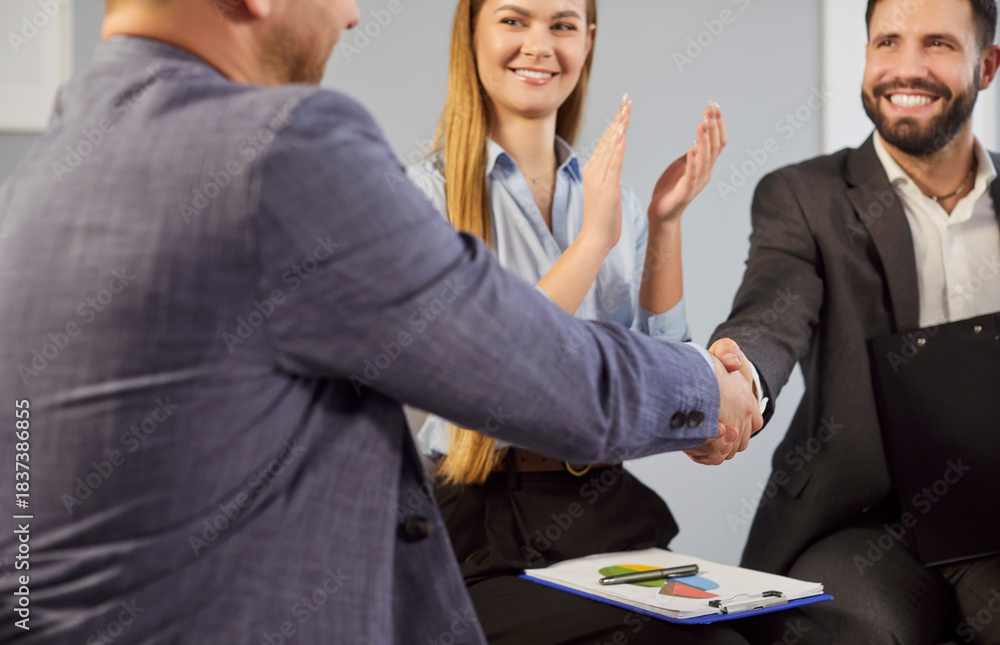 Coworker team in group exchanges handshake during meeting in office, applauding to mark success or deal with agreement in a professional setting with focus on collaboration and achievement.