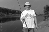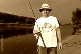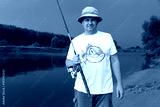 A fisherman stands with a fishing rod on the river bank. Fishing in nature in the summer, good mood.