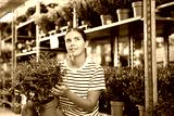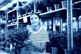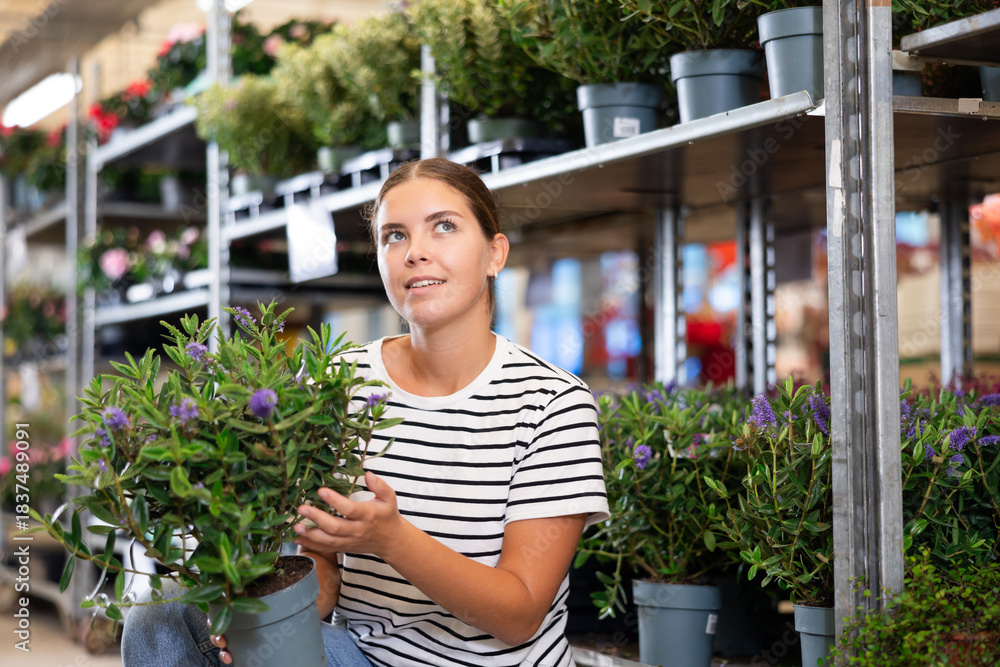 Girl customer-onlooker curiously examines showcase exhibition with indoor evergreens flowering hebe. Owner of offline flower shop inspects showcase with goods new arrival