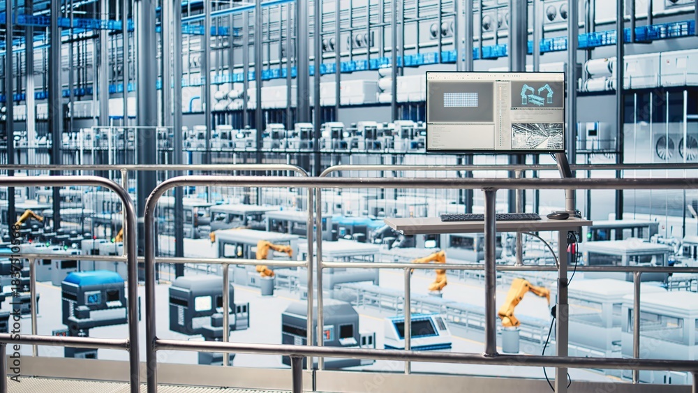 Monitor displaying industrial analytics dashboard for Industry 4.0 photovoltaics plant equipment. Solar panels smart factory display visualizing robotic arms performance and metrics from sensor data