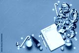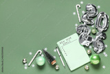 Notebook with to-do list, figure 2026 and Christmas decor on green background