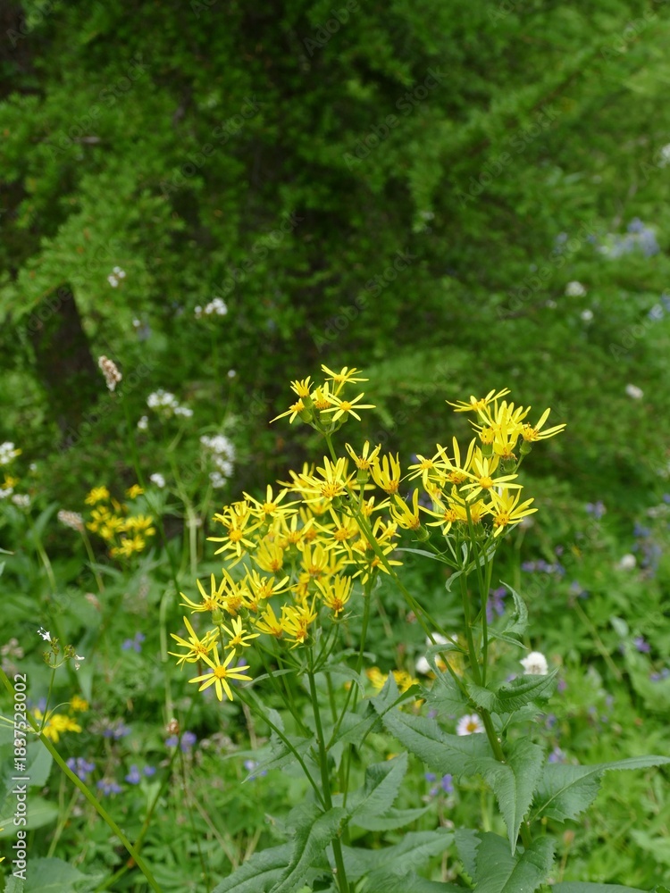 Vibrant yellow wildflowers blooming in lush meadows of Paradise, a subalpine haven in Mount Rainier National Park, Washington