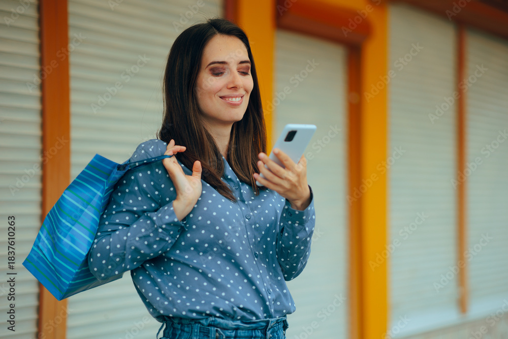 Happy Woman Holding a Shopping Bag and her Smartphone. Carefree shopping using mobile app to purchase and pay