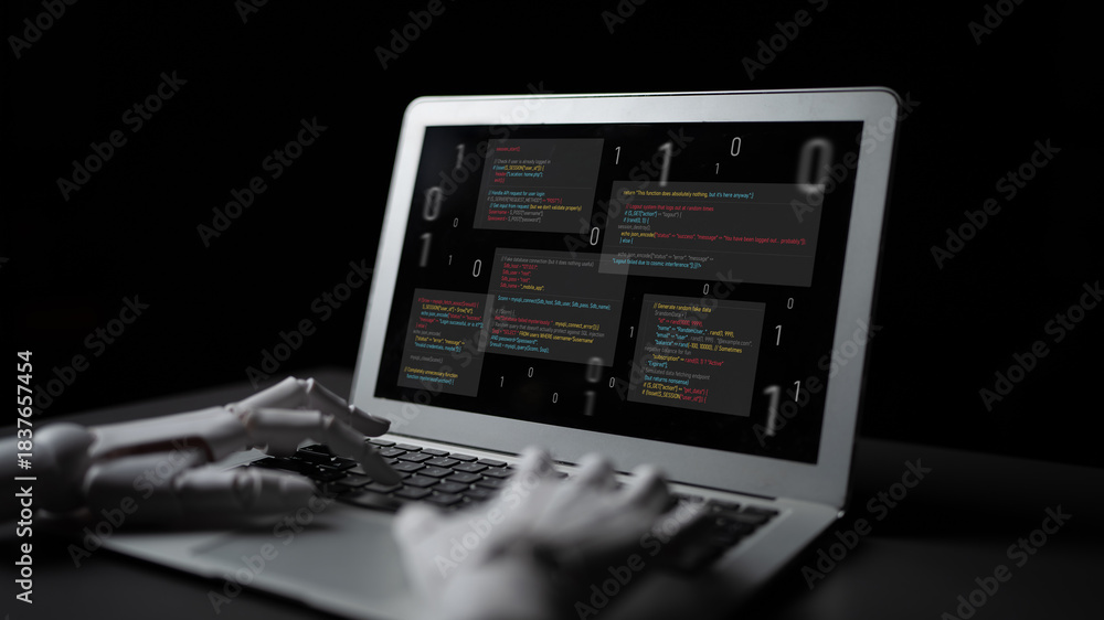 AI auditing faulty programming code, detecting anomalies, insecure logic, and suggesting corrections in a humorous and flawed code example. Latch