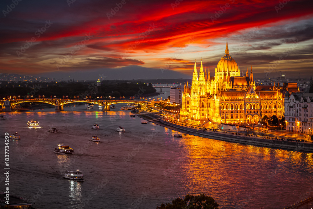 Night view of Hungarian Parliament and the Danube river at night, Budapest, Hungary
