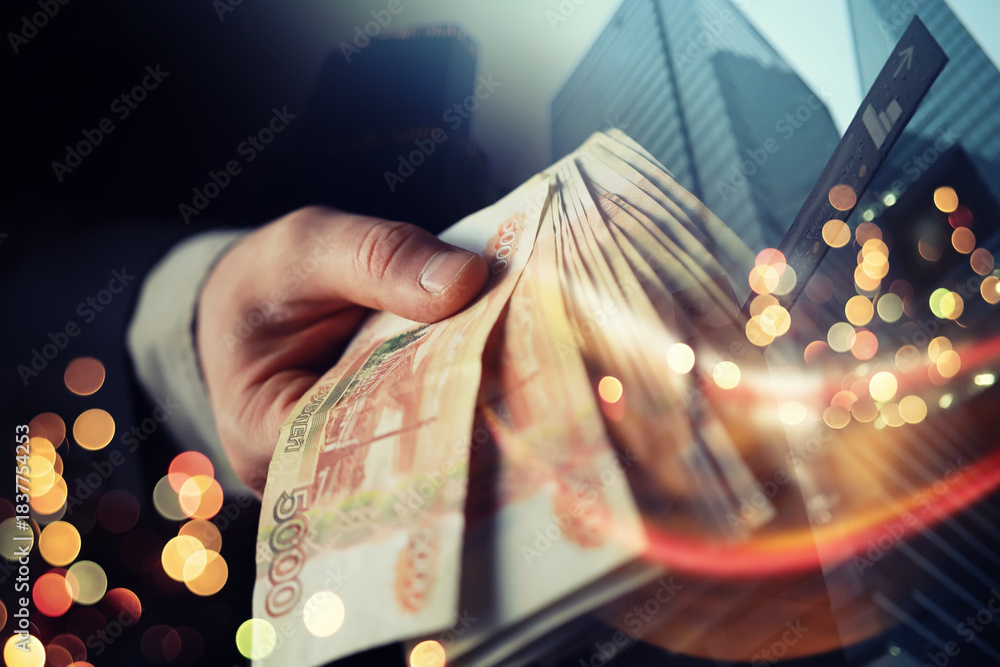 Businessman in suit holding money in his hands. Freedom, success man double exposure skyscraper