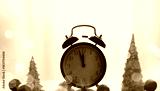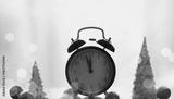 Christmas gifts, fir branches and alarm clock on wooden table. Boxing day
