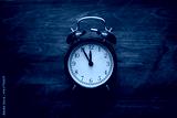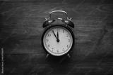 Vintage Black Alarm Clock on Dark Wooden Surface Indicating 12 O'Clock
