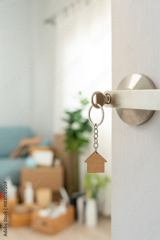 Moving house, relocation. The key was inserted into the door of the new house, inside the room was a cardboard box containing personal belongings and furniture. move in the apartment or condominium