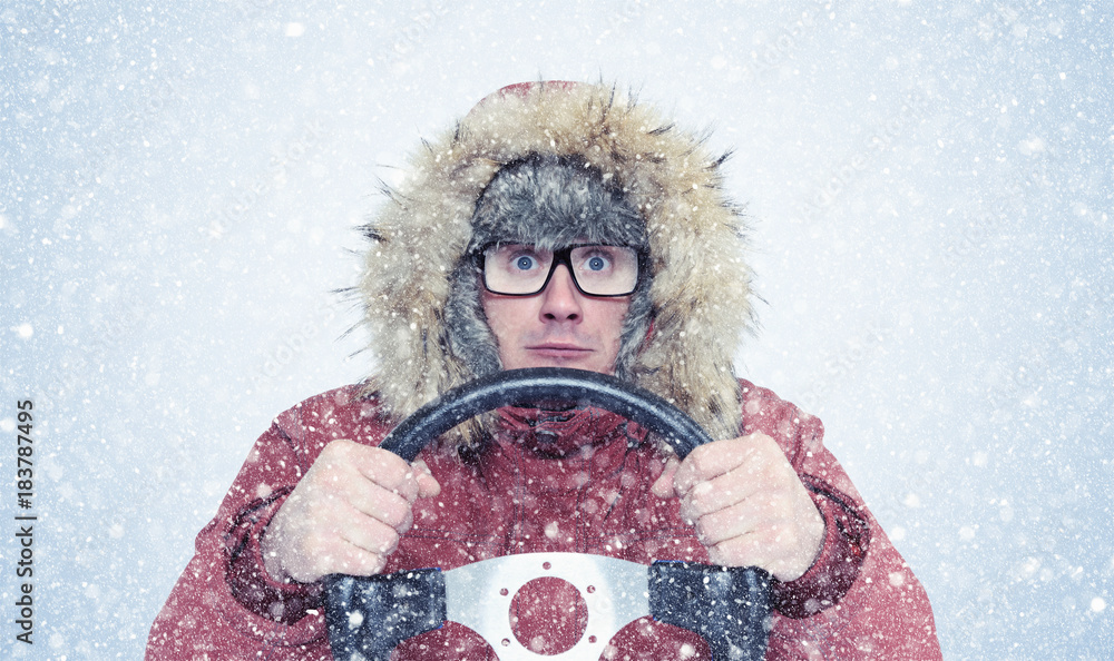 Man in winter clothes with a steering wheel, snow, blizzard. Concept car driver